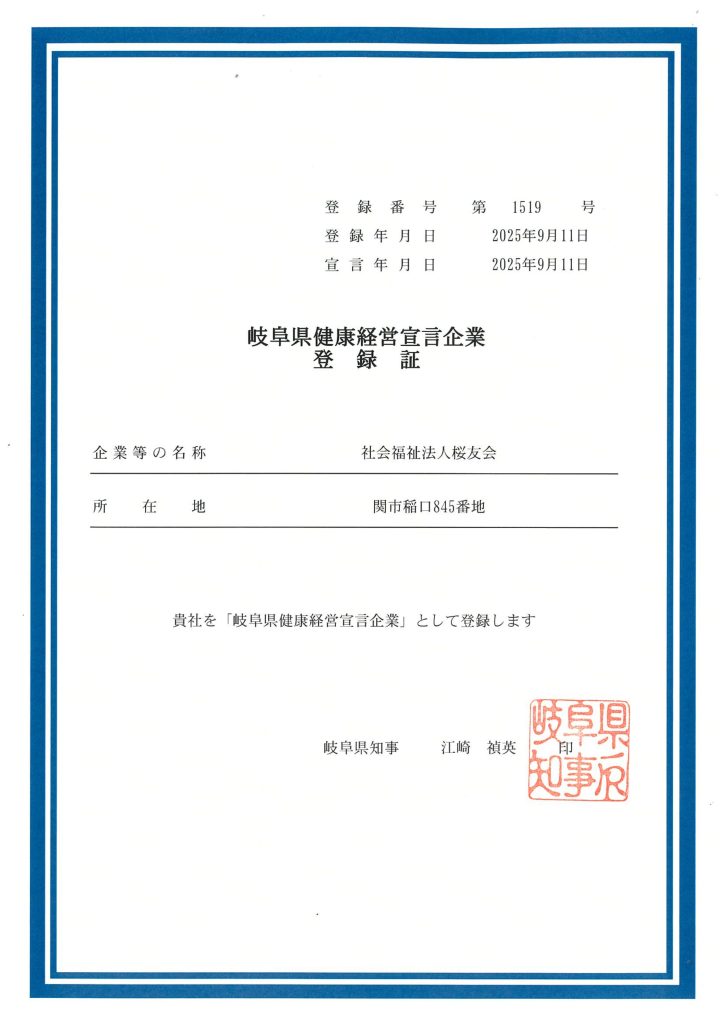 桜友会では、職員が心身共に元気で働ける事業所を目指して、岐阜県健康経営宣言企業に登録しています。